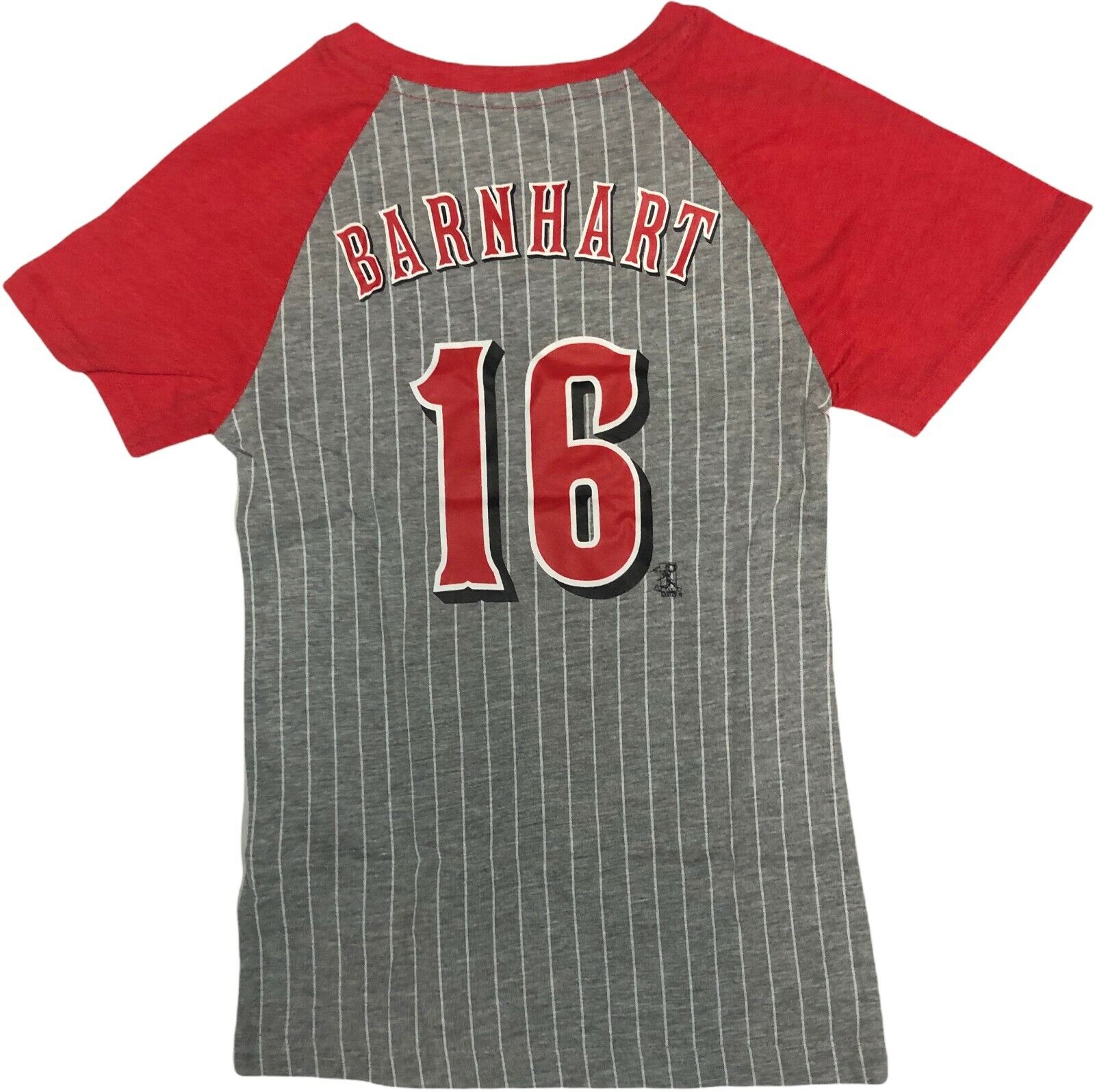 Cincinnati Reds Girl's V-Neck Pin Stripe Barnhart #16 T-Shirt Gray Red 6/6X
