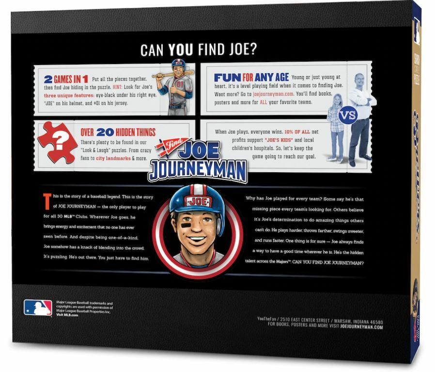 First you have to put the New York Yankees puzzle together. Then you have to find Joe Journeyman - the only player to play for all 30 MLB teams - and discover dozens of laugh-out-loud scenes in these hand-drawn illustrations of MLB stadiums, their fans and their landmark surroundings. The New York Yankees seek and find adventure puzzle is officially licensed by Major League Baseball for use by Joe Journeyman, a YouTheFan brand.