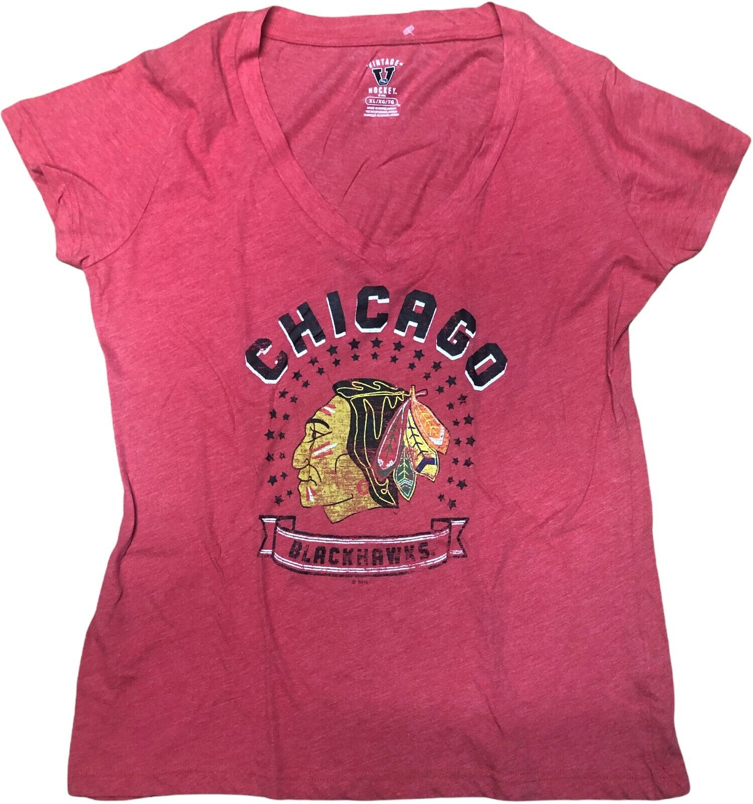 Chicago Blackhawks NHL Women's Distressed T-Shirt Red XL 100% Authentic Officially Licensed Merchandise 60/40 Cotton Blend Machine Washable Fast and Free Lighting Shipping Ebay Seller Since 1998