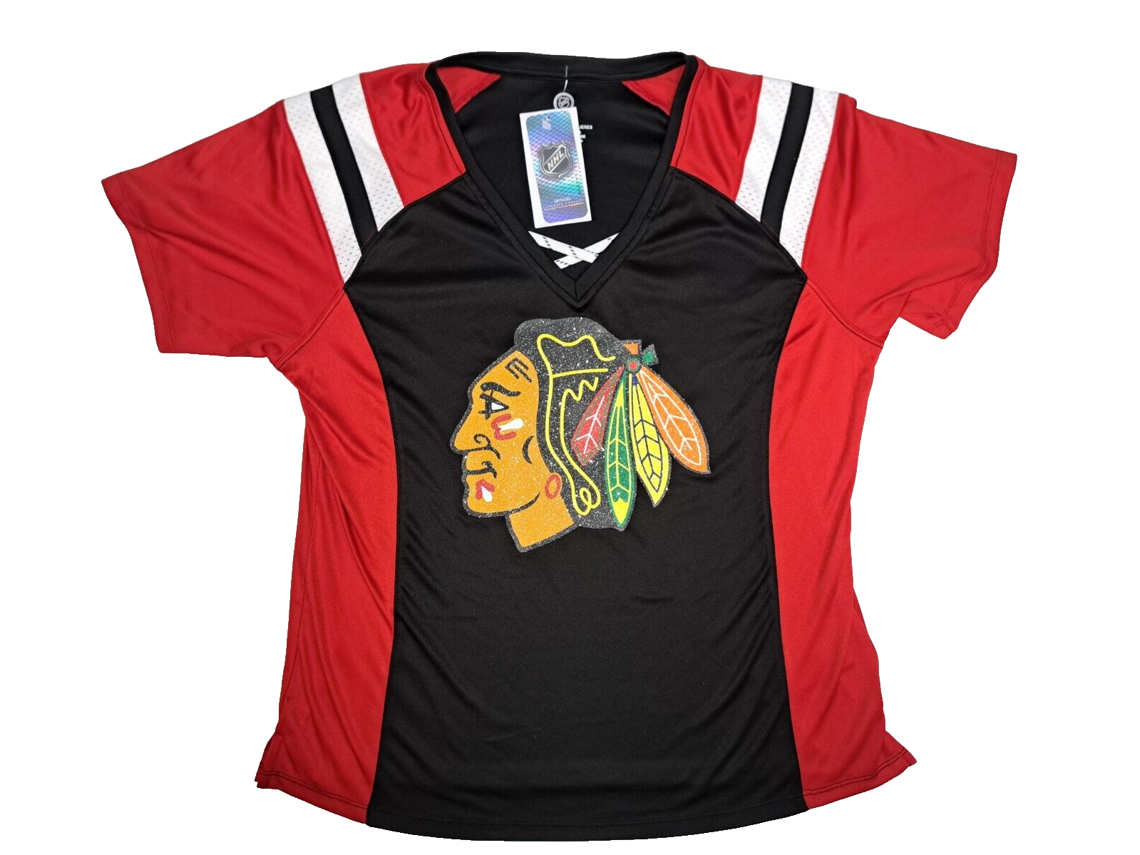 Chicago Blackhawks NHL Women's Lace Neck Poly Jersey Shirt Large 12/14
