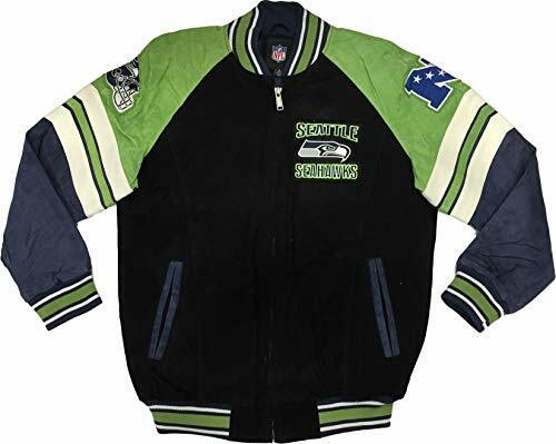 NWT G-III Seattle Seahawks Suede Adult Men's Jacket OFFICIALLY LICENSED FAST AND FREE SHIPPING Silhouette: Varsity jacket Fabrication: Heavyweight, non-stretch suede Trim: White faux leather piping and color-blocked accents Style: Black body with color-blocked primary and secondary team color accents Embellishments: Embroidered team name and logo patch on left chest;...
