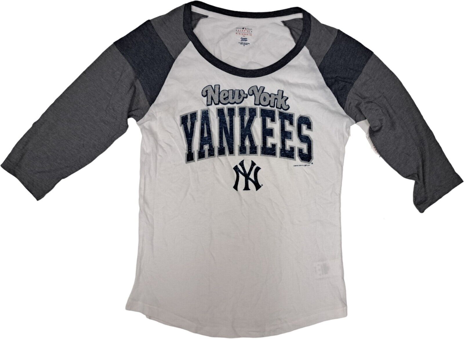 New York Yankees MLB Women's 3/4 Sleeve Distressed T-Shirt Medium 100% Authentic Officially Licensed Merchandise by Campus Lifestyle 50/50 Cotton / Poly Machine Washable Fast and Free Lighting Shipping Ebay Seller Since 1998